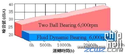 测试数据三:同规格双滚珠轴承和FDB轴承风扇在长期运转以后噪音的表现对比。