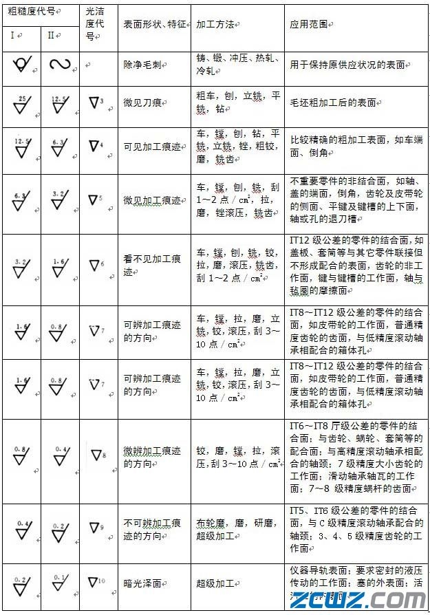 2. 粗糙度代号Ⅱ为第2种过渡方式。它是取新国标中相应最靠近的上一档的第1系列值,如原光洁度为▽5,Ra的最大允许值取3.2。因此,取该值提高了原表面粗糙度的要求和加工的成本。