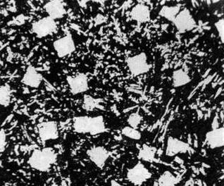 Pb-Sb二元合金相图(图2)具有共晶型转变。共晶成分中WSb为11.2%。图中Sb含量在17.5%~20%间为合金的室温组织,由初生β相硬质点和(α+β)共晶软基体组成。但是由于二元Pb-Sb合金同样有严重偏析,而且β相很脆,易破碎,基体又太软,易磨损,因此Pb-Sb合金还加入Cu、Sn等其他元素。加Cu可形成Cu3Sn,防止比重偏析,还可形成Cu2Sb硬质点,提高合金耐磨性。加Sn能形成金属化合物SnSb硬质点,它能大量溶解于铅中而强化基体,故可提高合金的强度和耐磨性。ZPbSb16Sn16Cu2是工业中最常用的铅基轴承合金,其WSb=16%、WSn=16%、WCu=2%,属于过共晶合金。其组织中的(α+β)共晶体是软基体,白色方块为化合物SnSb,白色针状晶体是化合物Cu3Sn。初生的β化合物Cu2Sn、SnSb是合金中的硬质点(见图3)。