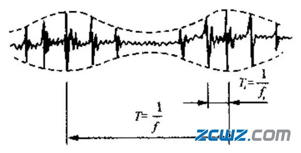 若载荷的作用方向不变,当滚动轴承内圈转动时,则损伤点和载荷的相对位置关系呈周期变化。每次碰撞有不同的强度,振动幅值发生周期性的强弱变化,呈现调幅现象,周期取决于内圈的转频,图3所示。