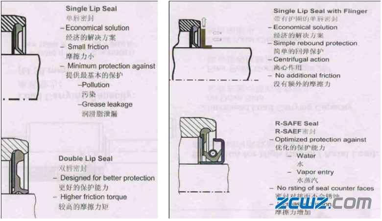 1、2个密封唇口均与轴承不发生接触,启动力矩低,发热量小;