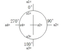 在测量0°~360°之间平分四等分点时,按照图2所示的划分方法将表1、主表、副表的零刻度线分别回零,记录下点1位置表1、主表、副表在零位的量值a1=0、s1′=0、s1″=0。旋转两半联轴器至点2位置,记录下a2、 s2′、s2″的数值;旋转两半联轴器至点3位置,记录下a3、s3′、s3″的数值;旋转两半联轴器至点4位置,记录下a4、s4′、s4″的数值;旋转两半联轴器至点1位置,表1、主表、副表在雾位的量值a1=0、s1′=0、s1″=0,确定此组测量数值的正确性。圆外记录径向读数al, a2, a3, a4,圆内记录轴向读数s1=0, s2= (s2′+ s2″)/2, s3= (s3′+s3″)/2,s4= (s4′+ s4″)/2。如果主表、副表测量点为联轴器内侧时,则s1、s3的读数在后续判断调整支点计算中应为此数的相反数。