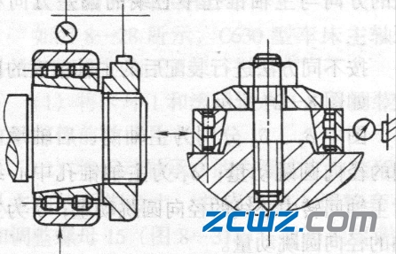 对精度要求较高的主轴部件,为了提高主轴的回转精度,轴承内圈与主轴装配及轴承外圈与箱体孔装配时,常采用定向装配的方法。定向装配就是人为地控制各装配件径向跳动的方向,合理组合,采用误差相互抵消来提高装配精度的一种方法。装配前需对主轴轴端锥孔中心线偏差及轴承的内、外圈径向跳动进行测量,确定误差方向并作好标记。