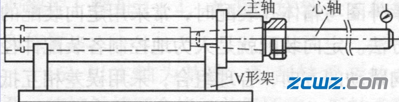 (3)主轴锥孔中心线的检测。如图9所示, 测量时将主轴轴颈置于V形架上,在主轴锥孔中插入测量用心轴,转动主轴一周以上,便可测得锥孑L中心线的偏差数值及方向。