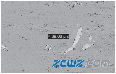 图4所示为轴承套圈上的碳化物形貌。由于碳化物、氧化物等夹杂物的韧性差,并且与周围基体材料之间形成分明的界面,当其尺寸较大且存在于轴承工作表面与次表面之间时,受到挤压后容易碎裂,其周围边缘若干凹沟处受到两边凸出材料的频繁挤压与松弛很容易产生疲劳裂纹,从而成为剥落起始点。
