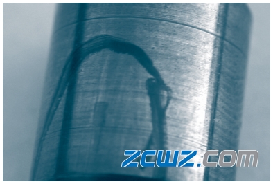 打滑蹭伤是细微磨损的一种特殊形式,由于轴承转速高、载荷轻,滚动件/滚道接触面在旋转时的强烈滑动而引起的。打滑蹭伤表现特征为印痕端部呈火花状。图5 是一典型的轴承套圈打滑蹭伤痕迹。