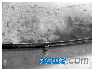 一裂纹从外圈端面延伸至滚道表面( 图 5) ;外圈滚道上运转轨迹发生偏斜,一侧磨痕靠近一端面倒角处,另一侧磨痕距另一侧端面处约30 mm,滚道表面有烧伤现象,如图 6 所示。