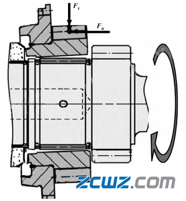在变速器中,滚针轴承的作用是支撑轴上的游动齿轮。其中,轴的外径相当于滚针轴承的内滚道,齿轮的内孔相当于滚针轴承的外滚道,内、外滚道与滚针和保持架一起组成了一个完整的滚针轴承。(如图1所示)。