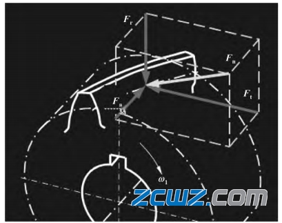 变速器中的游动齿轮通常为斜齿轮,在传扭运转过程中,受力分析如图3所示。其中,法向力Fn为齿轮的综合受力;切向力Ft使齿轮传递扭矩;径向力Fr使齿轮内孔对滚针施加压力;由于齿轮轴向和径向间隙的存在,轴向力Fn使齿轮沿轴向倾斜,运转过程中形成摆动(如图4所示)。齿轮在摆动过程中,齿轮内孔相对于滚针产生了径向压力作用下的小位移轴向往复运动,这种运动称之为“微动”,因此产生的磨损,称之为“微动磨损”。