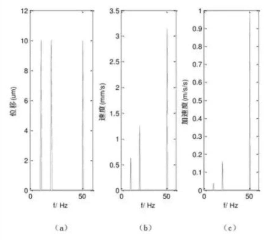 上图为同一个幅值为10um振动的位移信号、速度信号和加速度信号的频谱。可以清楚地看到,相同的三个频率分量中,加速度信号里表现强烈,速度信号表现适中,位移信号并不敏感。