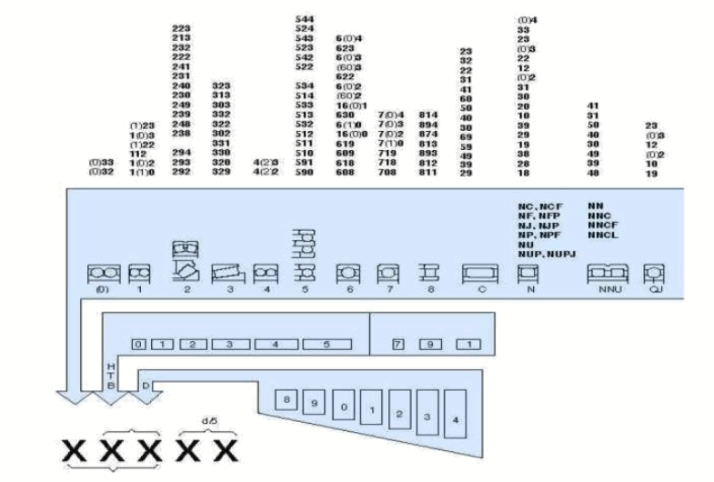 所有的SKF轴承型号标准都有特定的基本型号,通常有三个、四个或五个数字,或字母与数字的组成。几乎所有标准球轴承或滚子轴承的型号系统如所示。数字和字母与数字组合的意义如下: