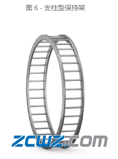 钢制支柱型保持架是以销钉贯通带穿孔的滚子并且只用于大尺寸滚子轴承。 这种保持架的重量相对较轻,可以容纳大量的滚子。