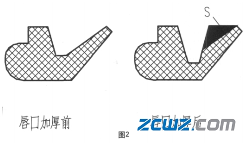 ②轴承密封圈内唇口变形而造成的喇叭口,主要是内唇口太薄,密封圈在注塑卸料过程中造成密封圈唇口变形,因此,这种情况须加大密封圈内唇厚度(见图2阴影部分);