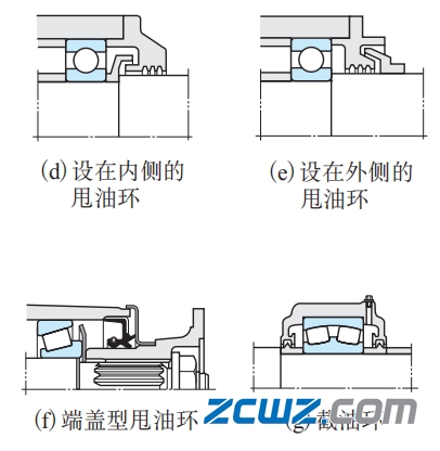 ③端盖型甩油环(图f)靠离心力将杂质或尘埃甩开,有利于防止外部异物侵人。