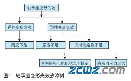 轴承座的变形失效可分为弹性变形失效和塑性变形失效两种情况。前者是指由于轴承座的刚度不足,工作过程中发生了过大的弹性变形,影响了轴承座的支撑、定位功能,引起发动机转子系统工作异常;后者是指由于发生了过大的塑性变形而造成轴承座的失效。根据轴承座塑性变形的产生原因,又存在两种失效情况,一种是由于轴承座强度不足,导致工作状态下的应力水平超过了轴承座材料的屈服强度;另一种是由于轴承座的尺寸稳定性不足,使零件在恒定或非恒定环境下发生了尺寸或形位的微小不可逆变化。