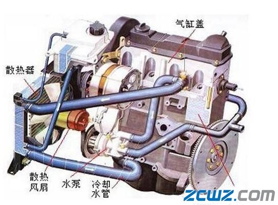 汽车在运行过程中发动机燃烧会产生大量的热量,但是发动机不能温度过高,否则会出现开裂变形、机油润滑不良、磨损加大等问题,造成发动机使用寿命缩短。所以给发动机进行降温是很重要的,在发动机缸体有很多冷却水循环水道,在发动机的上水口装有水泵,通过风扇皮带带动,再把水道中的热水泵出,冷水泵入,让发动机处在一定的温度范围内。