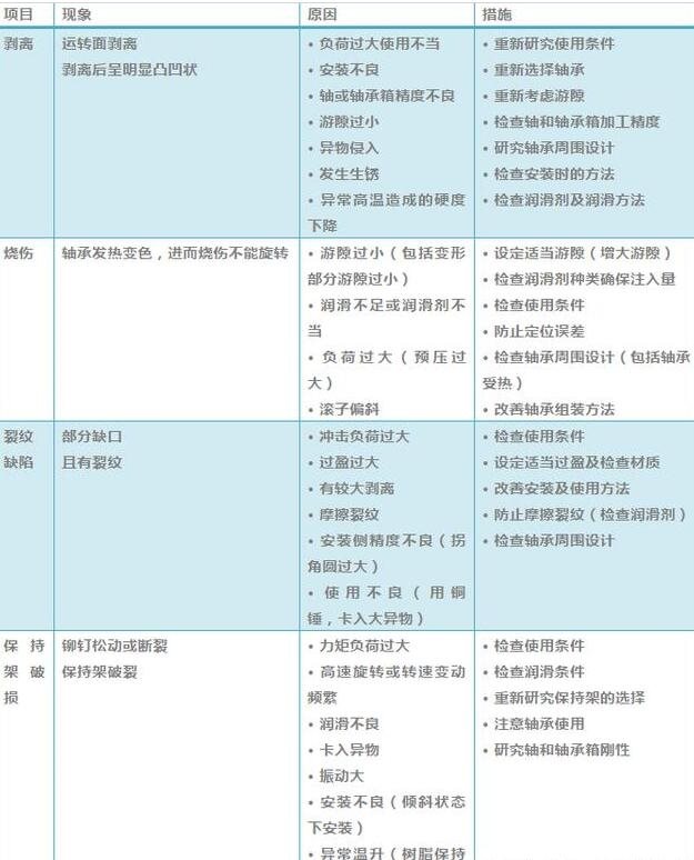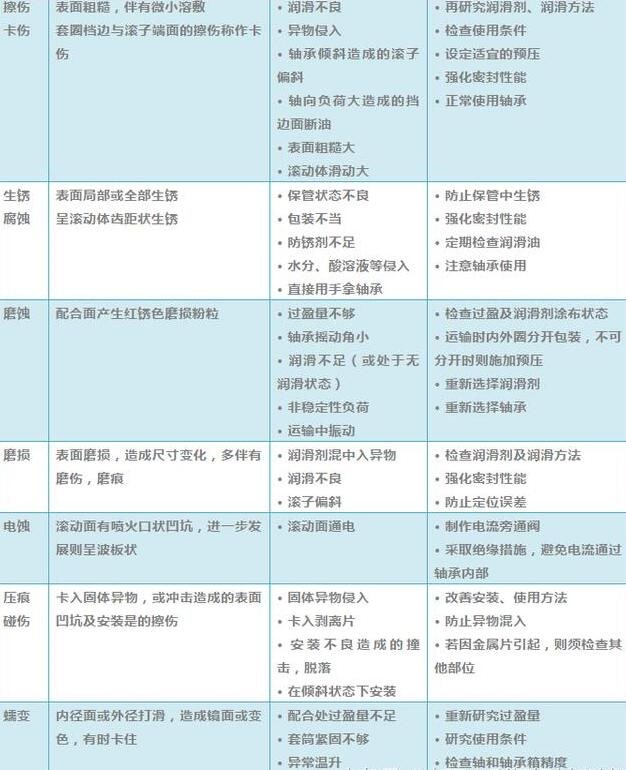 因此,在安装轴承时,我们需要记录机器种类,安装部位,使用条件及周围配合。通过研究总结轴承损伤的类型,发生问题时的使用环境,以避免类似情况再次发生。(图表内容比较好,建议大家收藏起来,以备不时之需!)