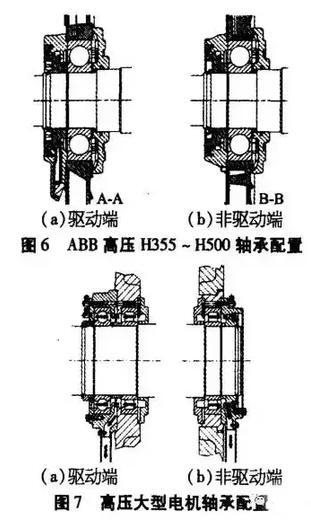 2)ABB公司电动机的轴承配置:低压机座号H355一H500均采用二轴承配置(2个中系列深沟球轴承),如图6所示。高压大型电动机采用三轴承配置,如图7所示。