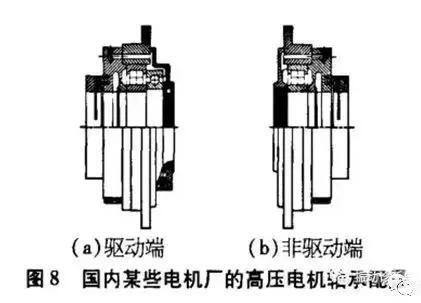 3)国内某些电机厂的高压电动机均采用三轴承配置,轴伸端的深沟球轴承为轻系列轴承,与西门子公司相同,如图8所示。