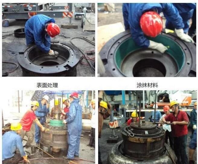 对于磨辊辊体磨损及轴承位、轴承室等传动部位磨损,传统工艺常常采用补焊后机加工,或者采用电镀等工艺进行处理,但是无论采用何种工艺,其最大缺点就是必须将设备大量拆除运输,其投入的人力物力比较大。另外补焊高温产生的热应力无法完全消除,易造成材质损伤,导致部件出现裂纹;而电刷镀受涂层厚度限制,容易剥落,且以上方法都是用金属修复金属,无法改变“硬对硬”的配合关系,而且无法达到100%配合面,在各力综合作用下,仍会造成再次磨损。
