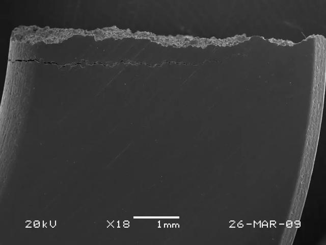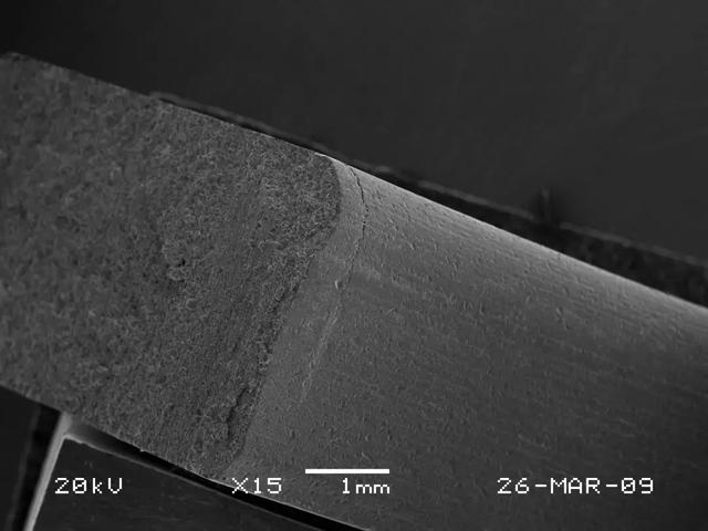 送检垫片在距其断口约1mm处存在一条平行于断口的微细裂纹;垫片的内径面有安装磨损痕迹,其光亮度不同,以有微裂纹一端最为光亮,而对应的另一端面附近则无磨损,保持原发黑处理的表面(见图2);垫片的断口平齐、色泽一致,为脆性断口(见图3)。