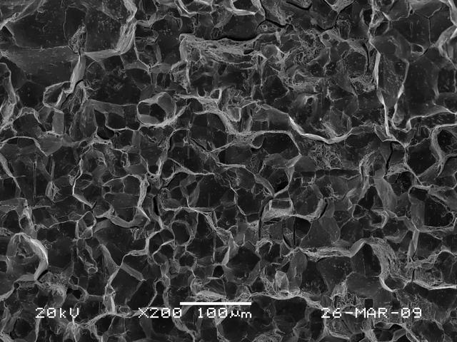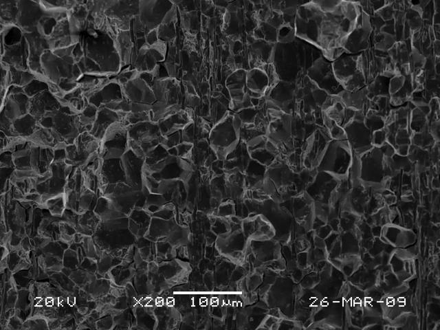①断口的扩展方向为从一侧端面的内径倒角处开始沿着对角线方向向另一端面扩展;断裂方式为沿晶脆性断裂;断口截面上未发现有晶粒粗大、过烧及大尺寸夹杂物等现象(见图4~图6)。