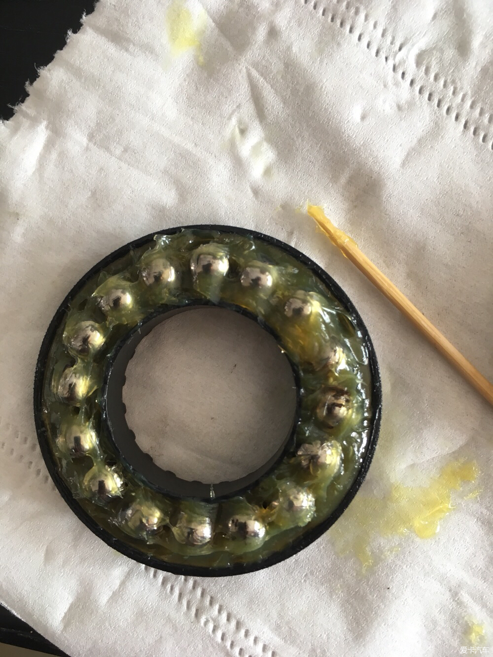 16颗钢珠用眼镜布再次清洁后依次放入,每次换顶胶保养一次,此轴承可以用一辈子。