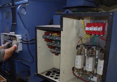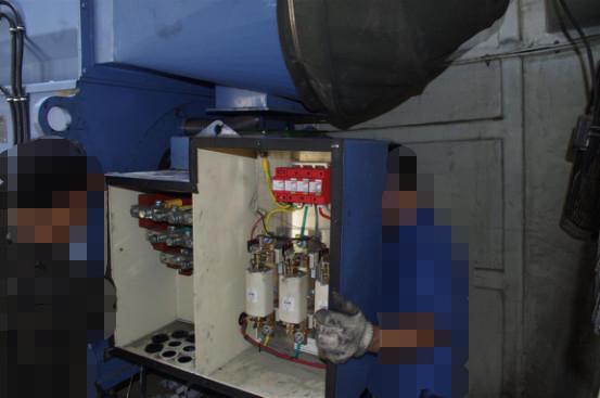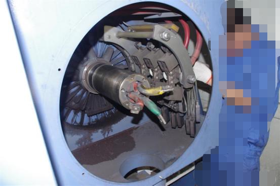 3.上述工作完毕后,将转子接线箱及相连的滑环室螺栓拆下,用吊带牢牢锁住,因为整体共150公斤重。至少需要4个人拖住,然后用顶丝将转子接线箱及相连的滑环室顶出,整个过程中要注意安全避免伤人。