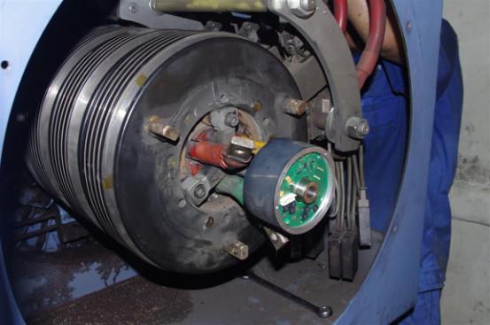 1.将发电机后端编码器、滑环、注油器油管及端盖附属部件用19mm、17mm扳手拆下、然后把发电机主碳刷和接低碳刷一并拆下后如图所示: