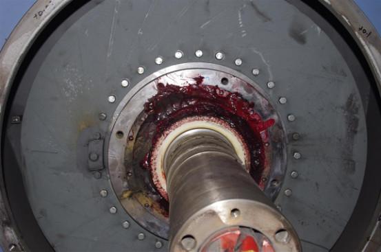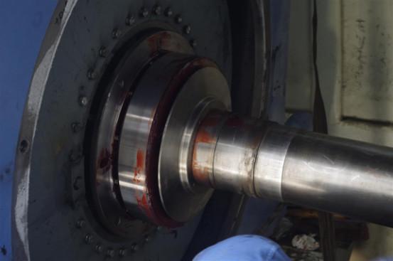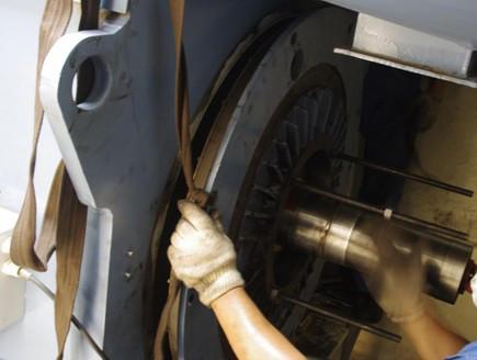 6.将上图中的电机端盖螺栓用36mm的套头扳手全部拆下后,如图所示在顶丝孔内插上顶丝,用24mm扳手进行操作,直到电机端盖完全顶开。因端盖较重,一定要注意安全。在此过程中切莫使电机端盖掉在轴上,避免损伤发电机轴,应轻轻的放置。如下图所示: