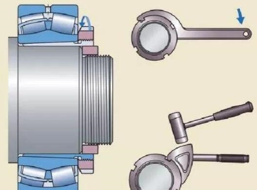 拆卸退卸套上的轴承时,必须卸下锁定装置。(如锁紧螺母,端板等)对于中小型的轴承,可以利用锁紧螺母、钩形扳手或冲击扳手来进行拆卸(图 10)。