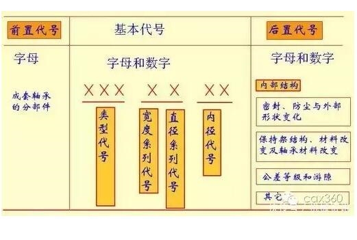 GB/T272—93规定了滚动轴承代号的构成及表示方法。 滚动轴承代号由前置代号、基本代号和后置代号构成,其代表内容和排列的顺序,见下表。