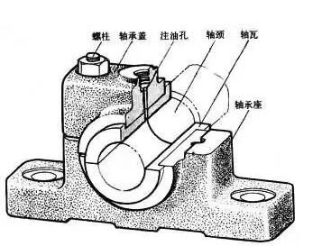 承受径向载荷的滑动轴承。轴被轴承支承的部分称为轴颈,与轴颈相配的零件称为轴瓦,做成整圆筒形的轴瓦称为轴套装轴瓦的部分总称壳件,其上半部称为轴承盖,下半部称为轴承座。盖和座用螺柱联接,两者的接合面由止口或销钉定位,并可放置不同厚度的垫片以调节轴承间隙。