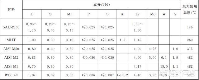 当轴承工作温度低于175摄氏度时,可采用普通的SAE52100轴承钢。MHT轴承钢是在SAE52100中添加1.3%的铝,它的工作温度可提升到260摄氏度。M-50适用温度在170~315摄氏度。M1和M2在500摄氏度时硬度还能满足要求,但这也达到它们抗氧化性能的极限。WB-49渗碳钢虽然高温性能好,可以在537摄氏度工作,但是目前的制造工艺还不足以做出可靠的滚珠,而只能用来做内、外环。滚珠则采用M1材质。