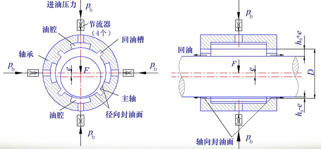 原理:依靠液压系统供给压力油,压力油在轴承腔内强制形成压力油膜,以隔开摩擦表面。