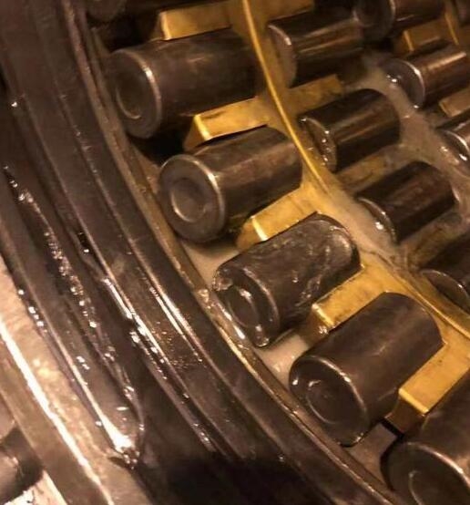 明天:从头到尾看了一遍,讨论的很激烈,同事也发表一下个人看法,首先分析铜保持架的变形原因,就在此轴承里来说铜保持架属于一个从运动零件,轧辊运转带动滚动体,滚动体带动保持架运转,如运转前无外力导致变形,即可以确定属于运转过程中滚动体的异常剥落导致的保持架及相邻的保持架齿变形。而滚动体的剥落,都是特定位置(群里讨论了,靠辊身的一列)个人认为三点原因造成,主因是装配划伤,因装配车装配时任何的不对中都会造成装配划伤,而装配划伤最严重的滚动体只存在1—4粒,即最上位置及左右和最下位置。第二列第三列第四列圆柱轴承因无任何调心性能,故受弯辊力的有害影响,也和划伤类似,即从靠辊身侧依次递减。同样在滚动体有伤的情况下还是第一列问题先爆漏。第3因素:比较次要一点的就是进乳化液,乳化液如携带颗粒物,即会污染或沉淀在第一列的交多些。