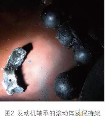 由于发电机转子与轴承内圈剧烈摩擦,轴承和发电机轴前端的高温使轴承内的油脂蒸发、气化,并产生大量的可燃气体。个别油脂分子在高温下,还可能出现分子链断裂,产生的可燃气体不需要明火在高温下就能点燃,有的油脂分子则在轴承中碳化变黑,如图2 所示。