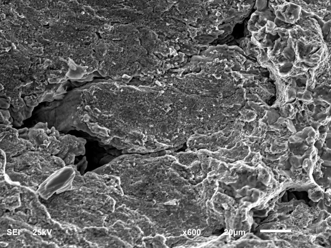 最后,扫描电镜断口分析。制取孔洞部位断口后,在JSM-6610LV扫描电镜下观察,可见断口上分布有大量有尖角状孔洞,孔内局部有金属熔融形貌,如图4所示。