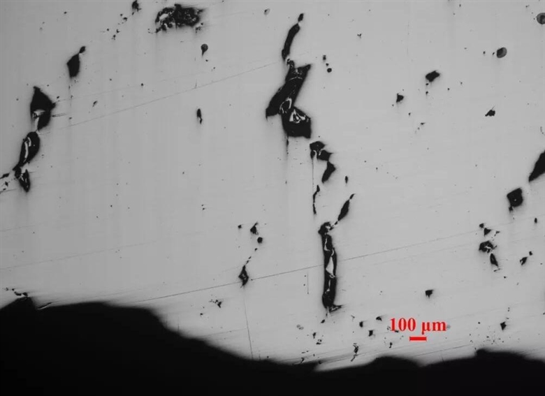 其次,金相观察。制取孔洞部位截面金相试样后在OLYMPUSGX51显微镜下观察,可见截面上有大量不规则尖角状孔洞分布,边缘有氧化,个别孔洞深不见底,其金相形貌如图3所示。