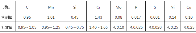 对外圈进行取样,大小为15mm×15mm×15mm,采用直读光谱仪进行化学成分分析,检验结果如表1所示,其化学成分符合GB/T18254—2016中GCr15SiMn标准要求。