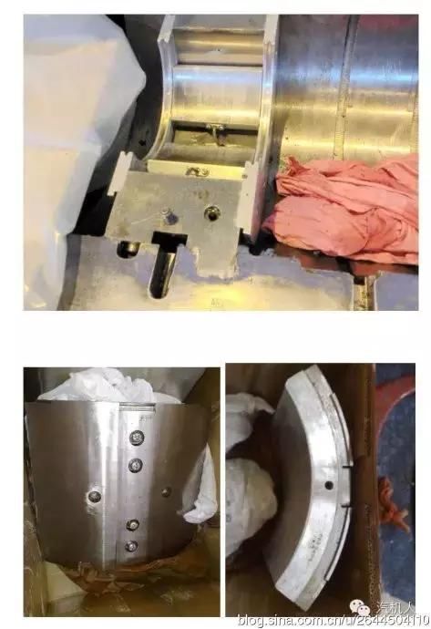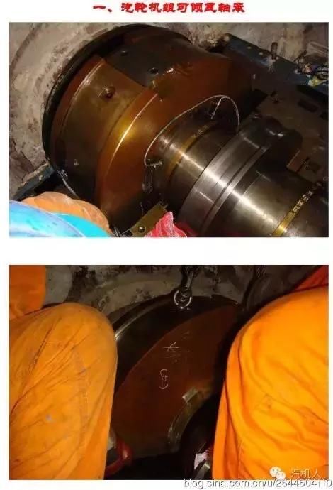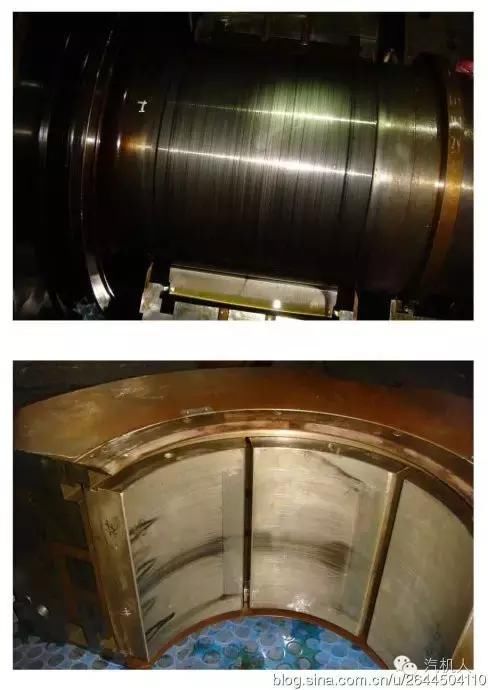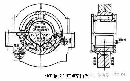 四块可倾瓦轴承,在上半两瓦块的背部,在沿转向的出油处设有弹簧,使瓦块在该背部有压向转子的倾向,防止瓦块的进油侧与轴颈产生制动的不良倾向,同时在瓦面进油侧修斜,以利润滑油进入瓦面。