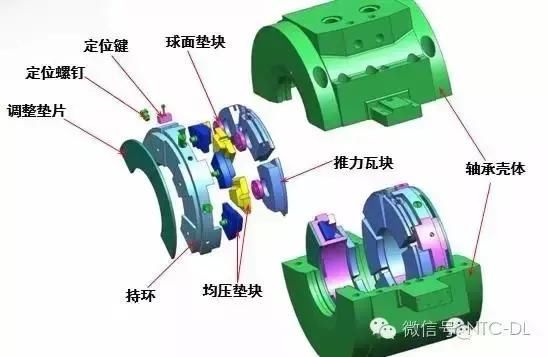这种结构特点是径向和推力轴承置于一体内,轴瓦体与轴承套之间为球面配合,使轴承随轴的挠度变形需要而自动调整,达到瓦面与转子上推力盘表面之间有较好接触,这种结构适用于挠性转子且轴向载荷不太大的机组。
