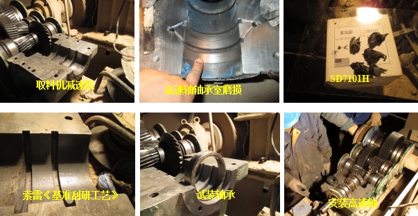 取料机减速机,轴承室磨损,轴承型号NU2309EM、32210(2盘)、磨损深度1-2mm,磨损宽度25mm*2(宽*处),转速1450r/min。根据设备磨损情况,以未磨损为基准进行刮研修复。