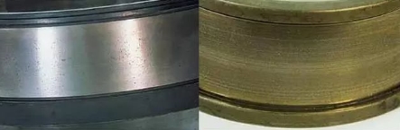 沟道单侧极限位置剥落主要表现在沟道与挡边交界处有严重的剥落环带。产生原因是轴承安装不到位或运转过程中突发轴向过载。