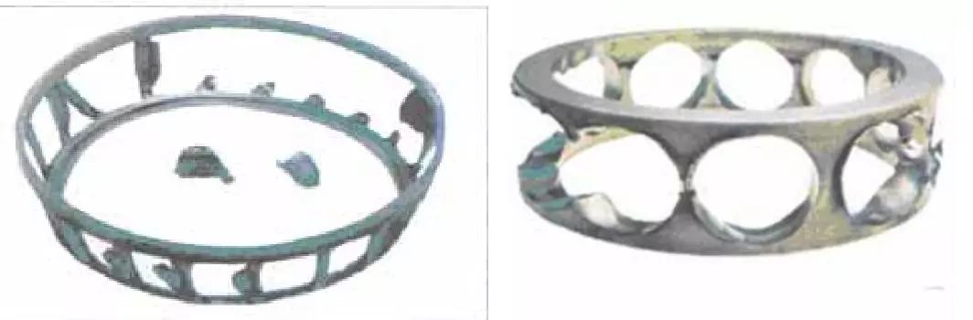 e. 保持架材料缺陷(如裂纹、大块异金属夹杂物、缩孔、气泡)及铆合缺陷(缺钉、垫钉或两半保持架结合面空隙,严重铆伤)等均可能造成保持架断裂。