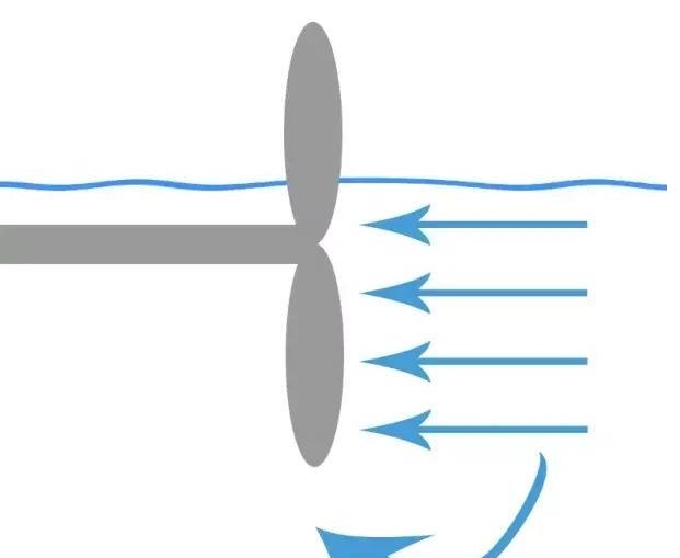 船舶的轴心线在各种负荷下实际是一个折线而不是一个直线,如果船舶的设计在轻桨裕度不是很富裕的情况下,螺旋桨就显得偏重,即通俗称为“重桨 heavy propeller”。之所以都是在压载状态下发生艉轴承高温,是因为此时,部分螺旋桨叶露出水面,螺旋桨下方受到水的反作用力而产生力矩(见图4)使得艉轴承负荷增加,因此整个轴系尤其是后部艉轴承就会承受过高的压力。当轴与轴承之间旋转形成的锲型油膜压力不足于支撑轴系负荷时,就使得轴与轴承之间产生干摩擦,从而导致艉轴承艉端烧熔。