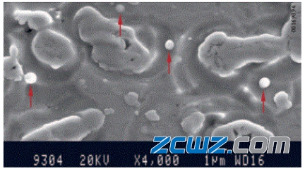 只有通过扫描电子显微镜(SEM),我们才会明显的看到几乎所有的损伤表面都密布着凹坑和μm级的焊点(如图5),这也证实了有电流通过轴承。
