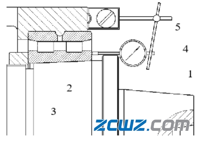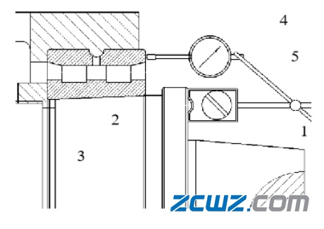 注:1主轴,2主轴前轴承。3主轴箱,4百分表,5磁力表座
