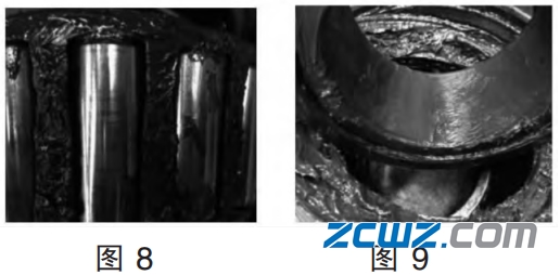 油脂变色也会导致轴承异音,影响轴承使用,威胁运行安全。下面这套轴承(如图 8、图 9)。经现场退卸后发现滚子划伤,油脂变色。经过对轴承、前盖、轴端螺栓、后挡、车轮、承载鞍、侧架、转向架等相关信息进行核查后,最终确定导致油脂变色及滚子划伤的原因是油脂中混入水且水中含有微小颗粒物,颗粒物导致滚子不同程度的擦伤及油脂变色,最终导致轴承异音。