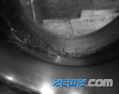 如图5所示,轴承内圈滚道面剥离, 从轴承外观检查中,发现左侧轴承卡滞、异音,经退卸、分解轴承后发现轴承内圈外滚道严重剥离,剥离面积约为30×25mm。